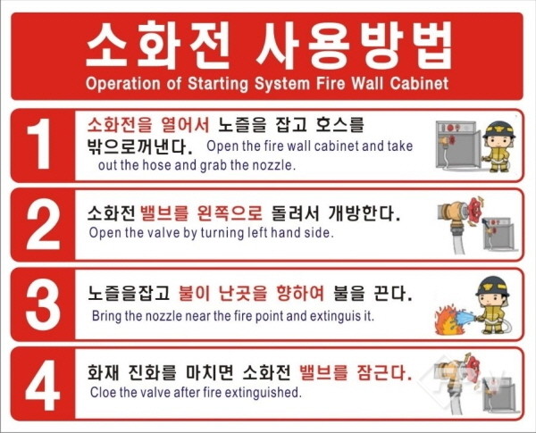옥내소화전설비의 화재 안전성능 기준(NFPC 102) 제7조 5항에 의하면 옥내소화전설비의 함 가까이 보기 쉬운 곳에 그 사용요령을 기재한 표지판을 붙여야 하며, 표지판을 함의 문에 붙이는 경우에는 문의 내부 및 외부 모두에 붙여야 한다. 이 경우, 사용요령은 외국어와 시각적인 그림을 포함해 작성해야 한다.