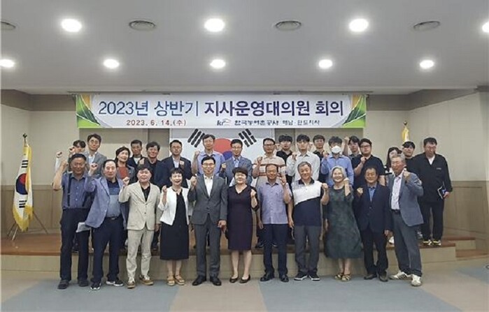 | ▲ 한국농어촌공사 해남·완도 지사, 14일 지사 대회의실에서 ‘2023년 상반기 지사운영대의원 회의’ 개최 후 제10기 위촉 운영대의원 13명과 함께 기념촬영 / 한국농어촌공사 해남·완도 지사 제공 |