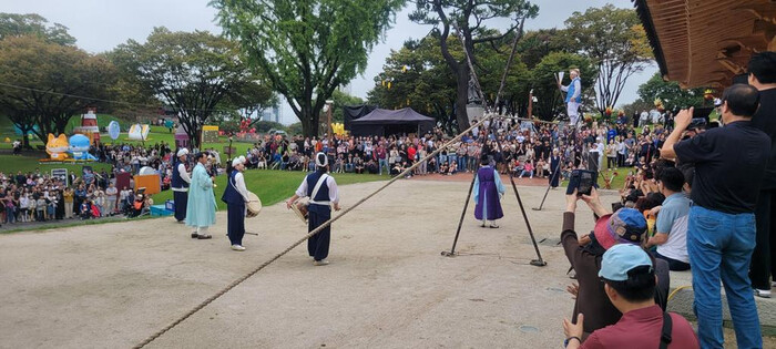 이번 공연은 이달 4일부터 9일까지 1일 1회(추석당일 제외), 총 5회 일정으로 많은 시민과 관광객이 참여해 낮 시간대에 펼쳐지는 공연임에도 관람석이 가득 찰 만큼 뜨거운 열기를 보였다.