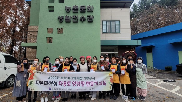 한국생활개선포천시연합회는 최근 경기 포천 나눔의집 소속 다문화 여성을 위한 다용도 양념장 만들기 교육봉사를 진행했다. 사진은 이날 교육 참석자 및 관계자들이 기념촬영을 하는 모습.(사진제공=포천시청)