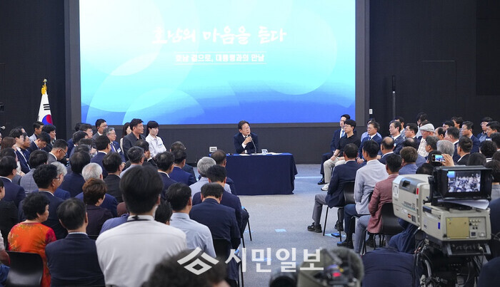 | ▲ 이재명 대통령이 25일 광주 국립아시아문화전당에서 '광주시민·전남도민 타운홀 미팅’을 열어 민군 공항 통합 이전 문제 등 지역 현안을 청취하고 있다. /광주광역시 제공 |