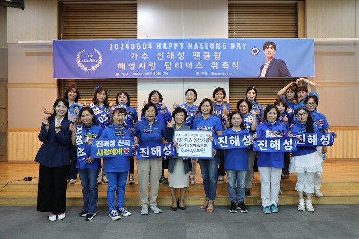 위촉식에 참여한 팬클럽 회원들은 “해성사랑이 탑리더스 위원이라는 큰 타이틀을 받게 되어 매우 영광스럽고, 가수 진해성님의 생일(6월 4일)에 그 어떤 선물보다 값진 선물을 전달하게 되어 기쁘다”며 “앞으로 일회성 후원에 그치지 않고 지속적으로 나눔을 실천하며 선한 영향력을 확산하는 데 앞장서겠다”고 소감을 밝혔다.