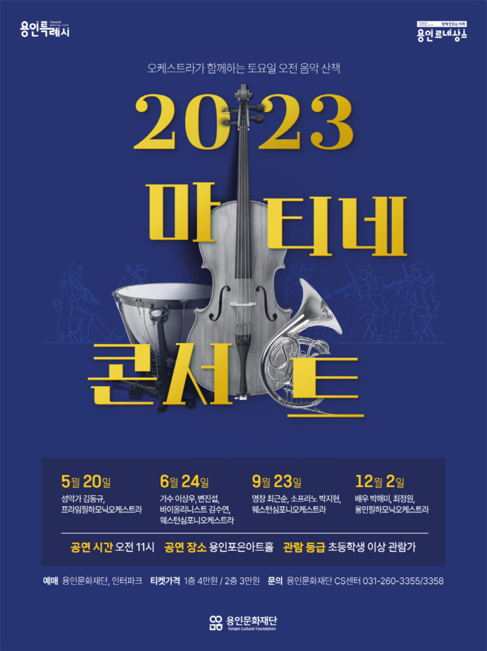 올해는 5월, 6월, 9월, 12월까지 총 4회 공연으로 클래식부터 대중음악, 국악, 뮤지컬 등 매회 다른 장르의 공연을 기획해 용인 시민들에게 다양하고 품격 있는 문화향유의 기회를 제공하고자 한다. 특히 그간 주중 수요일 오전에 진행됐던 일정을 토요일 오전 11시에 선보이면서 더 많은 관객들이 풍성한 공연을 즐길 수 있기를 기대하고 있다.