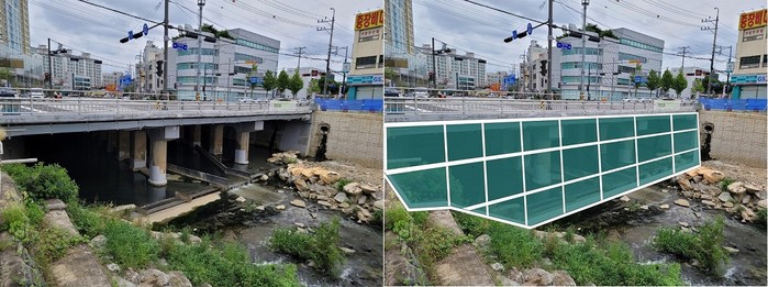 | ▲ 광주광역시 신안동 소재 신안교 악취 차단막 설치전(좌측)과 설치 후(우측) 모습 / 광주광역시 제공 |