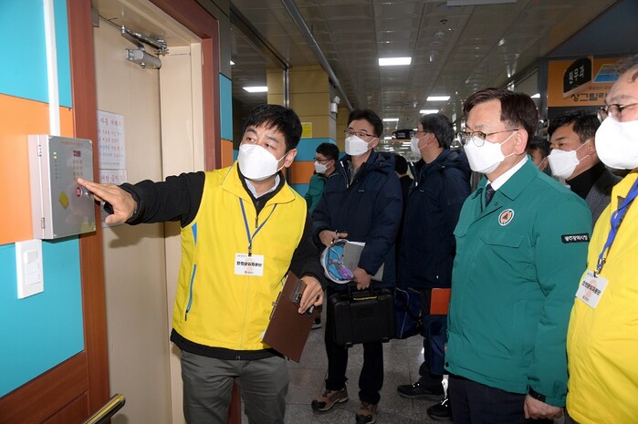 | ▲ 고광완 광주시행정부시장이 29일 오후 광산구 상그릴라 요양병원을 방문해 화재발생 대비 요양시설 안전관리실태 등을 점검하고 있다. /광주광역시 제공 |