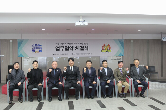 경기 화성시체육회가 지난 22일 화성시 코리요 독립야구단과 연고지 협약을 체결했다. 주요 협약내용은 경기도리그 대회 참가를 전제로 한 훈련 구장 사용 지원, ‘화성시’ 명칭 사용과 ‘코리요 캐릭터’ 사용 지원 등이다. 사진은 협약식에서 관계자들이 기념촬영을 하고 있는 모습.(사진=화성시청 제공)
