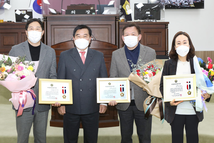 길기영·윤판오·이혜영 서울 중구의회 의원이 최근 대한민국시군자치구 의장협의회(舊 전국시군자치구의회 의장협의회)에서 수여하는 지방의정봉사상을 수상했다. 대한민국시군자치구 의장협의회는 지역 발전에 노력한 공로가 있는 기초의원을 매년 선정해 지방의정봉사상을 수여한다. 사진은 중구의회 본회의장에서 (왼쪽부터) 길기영 의원, 조영훈 의장, 윤판오 의원, 이혜영 의원이 기념촬영을 하고 있는 모습.
