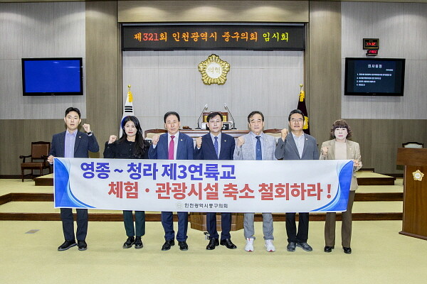[인천=김형만 기자] 인천 중구의회는 10월 14일 본회의장에서 ‘영종~청라 제3연륙교 체험·관광시설 축소 철회’를 촉구하는 성명서를 발표했다.