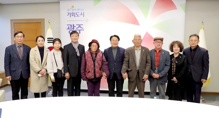 | ▲ 강기정 광주광역시장이 13일 오후 시청 3층 접견실에서 양금덕 할머니와 다카하시 마코토 미쓰비시 조선여자근로정신대 나고야소송지원회 대표 접견 후 기념촬영을 하고 있다. / 사진 왼쪽 다섯 번째부터, 양금덕 할머니, 강기정 광주광역시장, 다카하시 마코토 미쓰비시 조선여자근로정신대 나고야소송지원회 대표 / 광주광역시 제공 |
