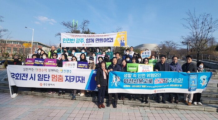 [광주=정찬남 기자] 광주광역시(시장 강기정)는 26일 상무지구 5‧18기념공원 앞 교차로에서 ‘안전실천! 안전광주!’를 주제로 민관 합동 안전문화 캠페인을 벌였다.