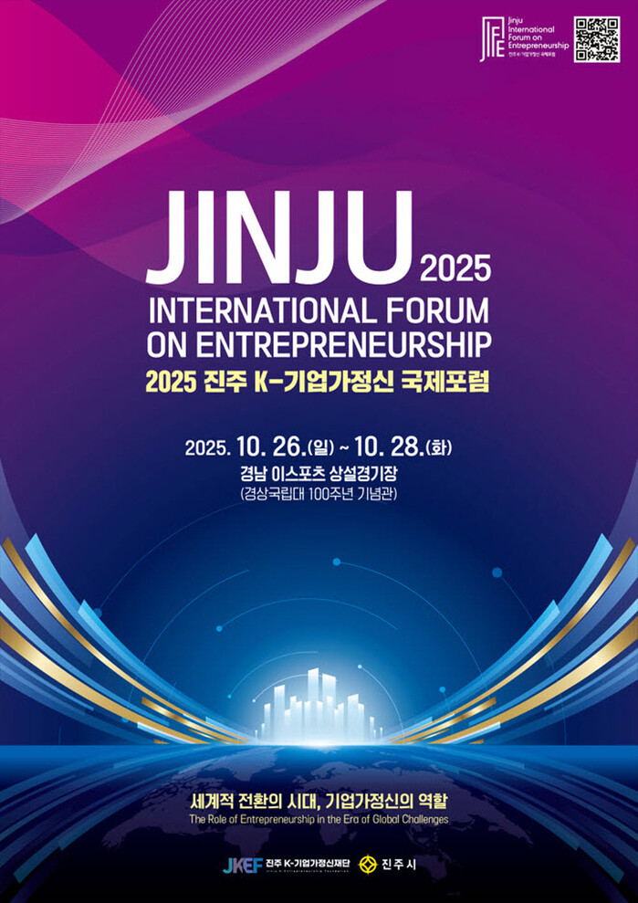 진주시와 진주 K-기업가정신재단은 오는 10월 26일부터 28일까지 경상국립대학교 100주년 기념관(경남 이스포츠경기장) 등 진주시 일원에서 『2025 진주 K-기업가정신 국제포럼』을 개최한다고 밝혔다.