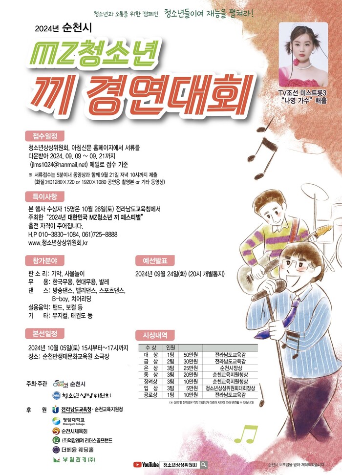 순천시 MZ청소년 끼 경연대회는 전라남도 동부권 문화 발전을 목표로 청소년들의 재능 발굴 및 문화 인재 양성을 위해 매년 개최되며, 특히 초·중·고 그리고 학교 밖 학생들이 참여해 통합 시상을 하고 수상자들에겐 장학금과 상장 전달식은 오는 11월16일 오후 2시경 조례호수공원에서 시상식 그리고 수상자 공연과 함께 전달한다.