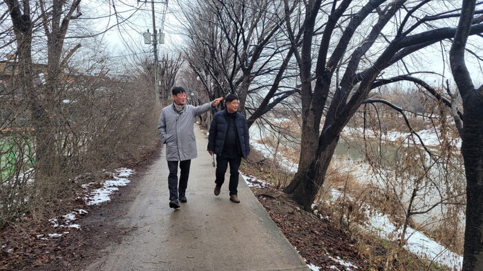 경기 수원시 권선구는 지난 22일 최근 기상악화와 관련해 지역내 주요 도로와 안전사고 취약지역의 현장점검을 실시했다. 이날 점검에서는 해빙기 이상기온 등으로 도로나 제방이 파손돼 큰 사고로 이어질 수 있는 하천과 및 지역내 도로 포트홀 발생지역을 집중적으로 점검했다. 사진은 기우진 구청장(왼쪽)과 관계자가 현장점검을 하고 있는 모습.(사진=권선구청 제공)