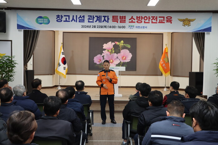 경기 이천소방서는 지난 22일 1급 이상 물류창고 관계자를 대상으로 특별안전교육을 실시했다. 주요 교육내용으로 대형창고 화재 사례를 통한 화재예방 교육, 중대재해처벌법 사례 및 각종 안전사고 예방교육 등이다. 사진은 교육이 진행되고 있는 모습.(사진=이천소방서 제공)