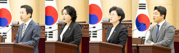 | ▲ 안산시의회가 11일 제292회 임시회 제2차 본회의를 열고 시정질문과 5분 자유발언을 실시했다. 사진 왼쪽부터 차례대로 시정질문에 임한 송바우나 의원과 5분 자유발언을 실시한 김진숙 박은경 최진호 의원의 모습 /사진제공=안산시의회 |