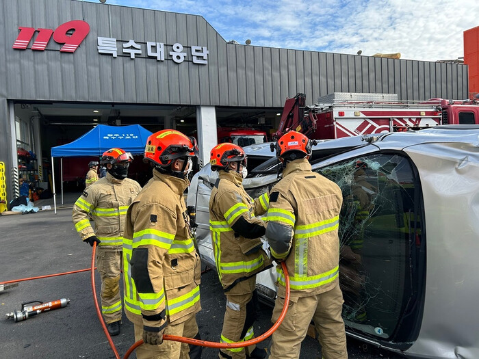 이번 훈련은 교통사고 차량 전복 등 특수상황을 재현해 차량 내 고립된 구조대상자에 대한 신속한 구조 등 인명구조 전문능력과 전기차 화재 대응 역량 강화를 위해 마련됐다.