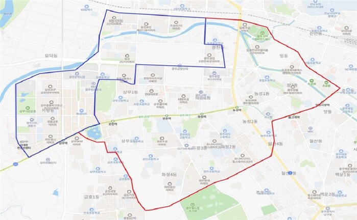 | ▲ 타랑께 23년 하반기 운영 구역 / 파란선 : 기존 운영 구역 / 붉은색 : 추가 운영 구역 / 광주광역시 제공 |