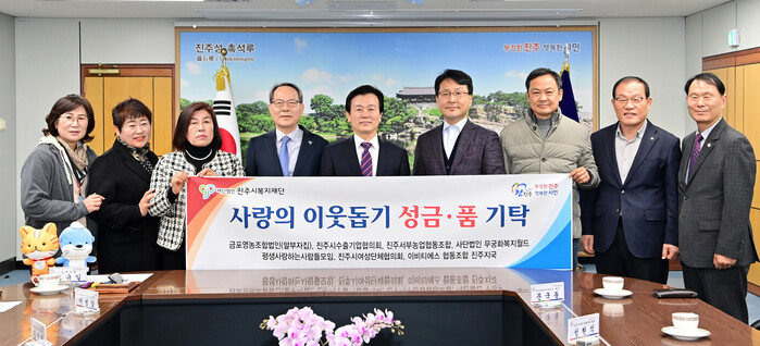 진주시복지재단(이사장 이성갑)은 24일 진주시청 기업인의 방에서 지역사회 기업 ·기관·단체의 어려운 이웃돕기 성금품 기탁식을 가졌다.