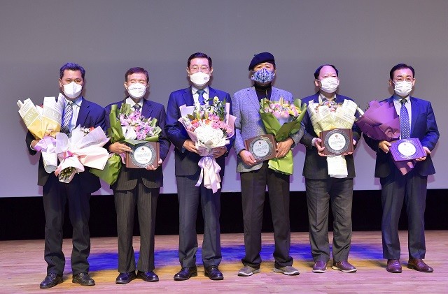 [광주=정찬남 기자] 이용섭 광주광역시장(좌측부터 3번)이 15일 오전 남구 빛고을시민문화관에서 열린 '제62주년 3·15의거 기념식'에 참석해 유공자 표창을 한 뒤 기념촬영을 하고 있다./광주광역시 제공