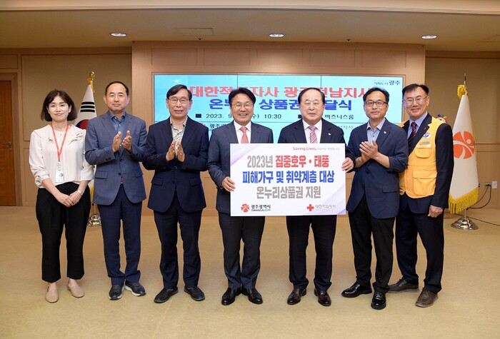 | ▲ 강기정 광주광역시장(왼 쪽부터 네 번째)이 27일 오전 시청 비즈니스룸에서 허정 대한적십자사 광주‧전남지사 회장으로부터 집중호우‧태풍 피해 세대 및 취약계층 지원을 위한 온누리상품권을 전달 받은 후 기념촬영을 하고 있다. /광주광역시 제공 |