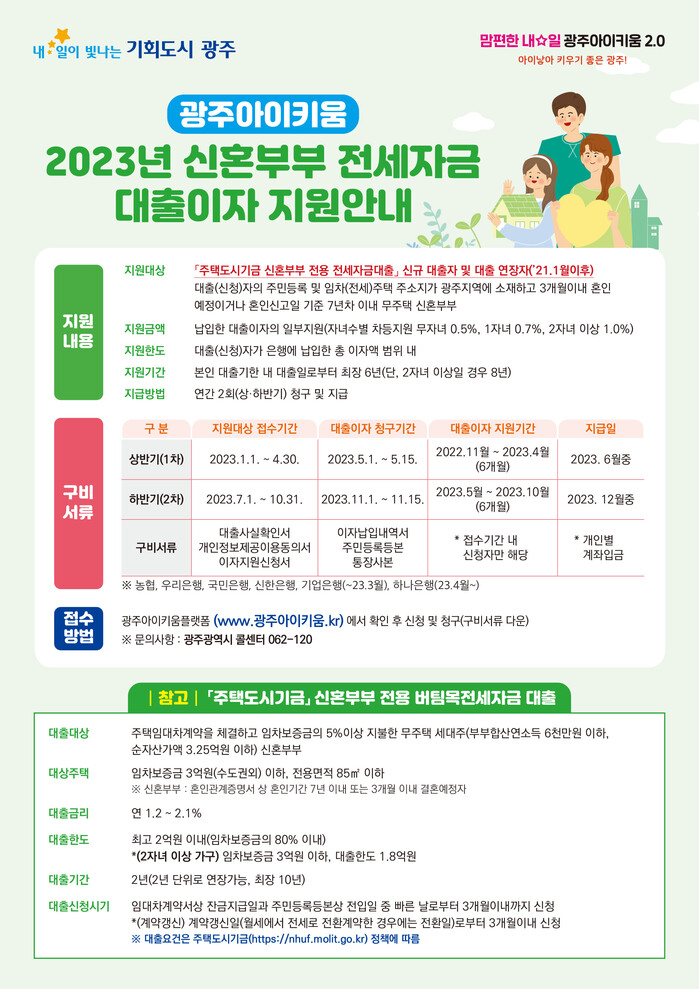 광주시는 4월30일까지 광주아이키움 홈페이지를 통해 상반기 신혼부부 전세자금 대출이자 지원사업 상반기분 신청을 받는다.
