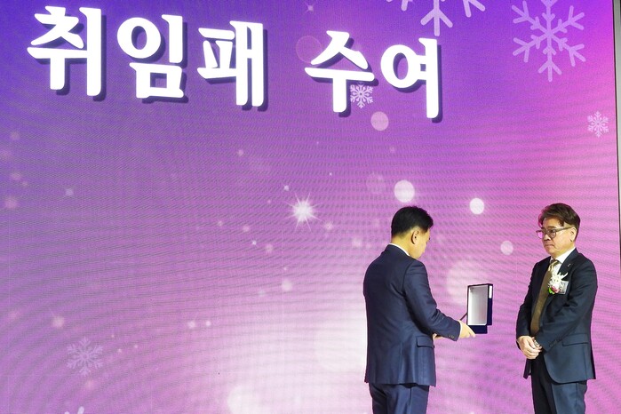 ▶이덕기 제15대 동화고 총동문회장(오른쪽)이 이병길 도의원으로부터 경기도지사 표창을 수상한 뒤 기념촬영을 하고 있다.[사진=최광대 기자]