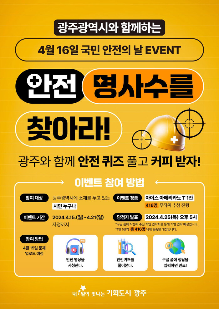 이번 이벤트는 4월 16일 국민안전의 날을 맞아 국민안전주간(4월 15~21일)에 광주시 누리집 알림창 ‘안전 명사수를 찾아라!’를 통해 광주시민안전보험과 교통사고 예방 캠페인 동영상을 보고 관련 문제를 풀어 구글 폼에 답을 입력하면 된다.