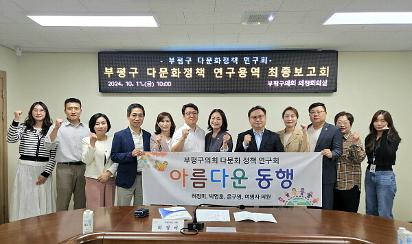 [인천=김형만 기자] 부평구의회 의원연구단체인 부평구 다문화 정책 연구회 ‘아름다운 동행’은 10월 12일 부평구의회 2층 의정회의실에서 부평구 다문화 정책 연구를 과업으로 하는 연구용역 최종결과를 보고 받았다.