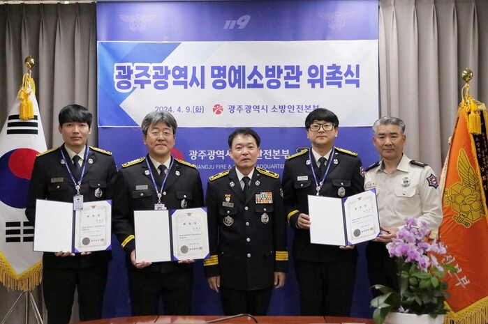 | ▲ 광주광역시소방안전본부, 지난 9일 광주소방본부에서 노학종, 전재우, 정효준 씨 등 소방악대 지도강사 3명에게 ‘광주광역시 명예소방관’ 위촉 및 명예소방관증 수여 기념촬영 / 광주광역시 제공 |