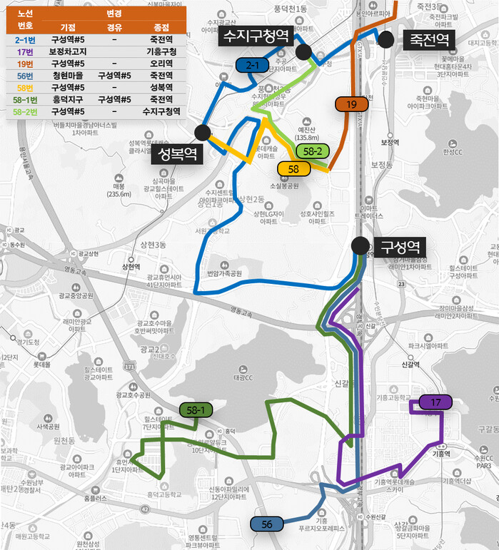 수지구 상현동·성복동·풍덕천동 등 일부 지역에서도 ▲2-1번(구성역~죽전역) ▲58번(구성역~성복역) ▲58-2번(구성역~수지구청역) 노선을 통해 구성역 이용이 가능해진다.