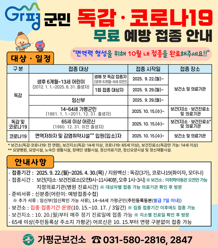 독감 예방 접종 일정은 대상별로 순차적으로 진행된다. 9월 22일부터는 어린이 생애 첫 독감 접종자, 9월 29일에는 어린이 1회 접종 대상자와 임신부, 10월 15일에는 65세 이상 어르신과 14~64세 가평군민을 대상으로 내년 4월 30일까지 접종이 이어진다. 코로나19 예방접종은 오는 10월 15일부터 65세 이상 어르신과 면역저하자 등을 대상으로 무료로 실시한다.