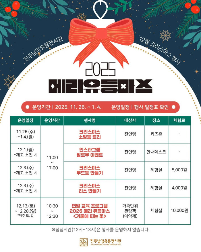 특히 체험 프로그램은 3일부터 참여할 수 있으며, 어린이 관람객에게는 ‘크리스마스 캐릭터 볼펜’과 ‘루돌프 사슴핀’ 등 기념품도 제공한다. 또한 전시관 SNS 팔로우 이벤트에 참여하면 ‘화산등 만들기 키트’를 증정한다.