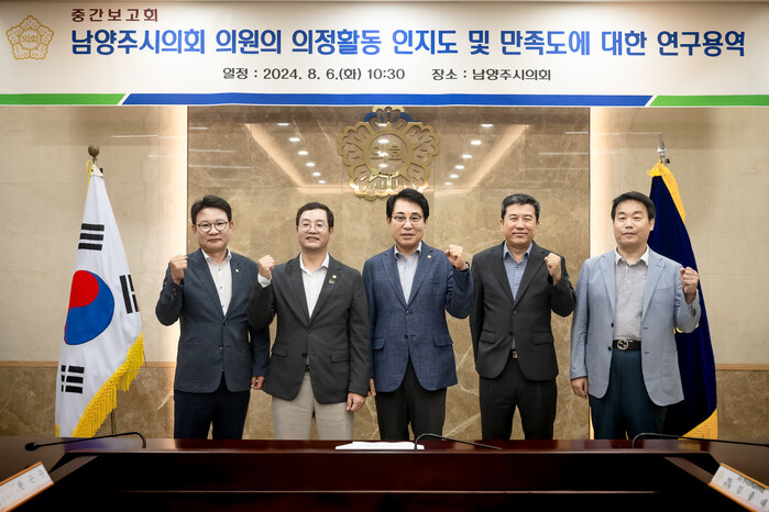 남양주시의회 의정활동 역량강화 연구모임은 한근수 의원을 대표의원으로 조성대 의장, 박경원, 김지훈(국), 김영실, 김지훈(민) 의원 등 총 6명의 의원이 남양주시의회 의원의 의정활동 인지도 및 만족도에 대한 연구를 주제로 주민들이 인지하는 의정활동의 만족도를 분석하고 이를 바탕으로 바람직한 의정활동 방향을 모색하고자 지난 4월부터 연구단체를 구성하고 활동을 시작했다.