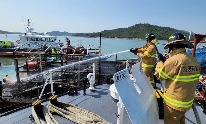 [목포=황승순 기자]전남 신안군 암태도 은암대교 인근 해상에서 선박 화재가 발생해 해경이 화재 진화에 나섰다.