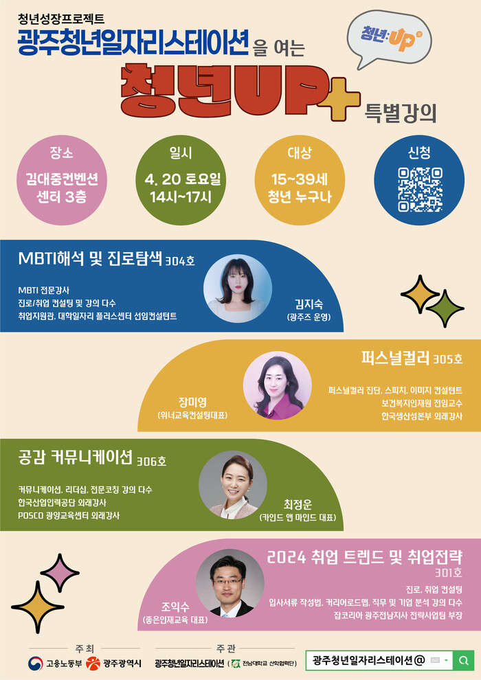 ‘청년UP+’ 특강은 15세부터 39세 청년 총 160여명(강의당 40명)을 대상으로, ‘MBTI 분석과 진로 탐색’, ‘맞춤 색상(퍼스널 컬러) 진단과 이미지 상담(컨설팅)’, ‘올해 채용 경향과 취업 준비 전략’, ‘공감 의사소통’ 등을 설명한다.