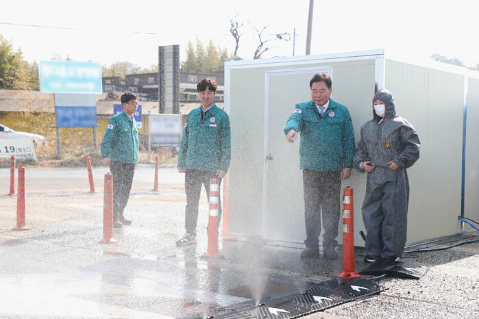 [무안=황승순 기자]김산 무안군수는 21일 무안군 전역에 설치된 방역 통제초소 5곳(일로 3, 몽탄 1, 청계 1)을 방문해 현장 근무자들의 노고를 격려하고, 차량 소독과 장비 작동 상태를 꼼꼼히 살펴보며 방역 상황을 재차 확인했다.