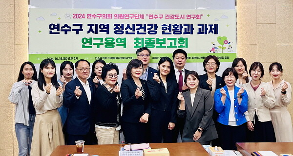 [인천=김형만 기자] 인천시 연수구의회 의원연구단체 ‘연수구 건강도시 연구회’는 10월 15일 의회 기획복지위원회 회의실에서 지역 정신건강 증진을 위한 정책 방안을 논의하고 연구 결과를 공유하기 위해 최종보고회를 개최했다.