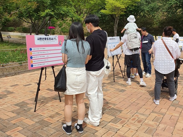 | ▲ 광주시민들이 지난 28일 광주 우치공원에서 진행된 광주자치경찰 브랜딩 공모전 선호도 조사에서 현장투표 방식으로 참여하고 있다. / 사진 = 광주광역시 제공 |