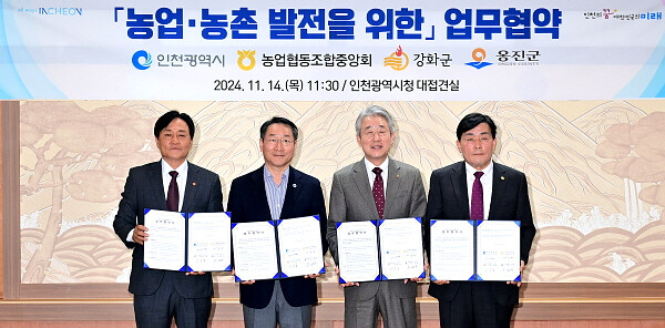 [인천=김형만 기자] ] 인천시는 11월 14일 농업‧농촌 발전과 지역사회 활성화를 위해 농업협동조합중앙회, 강화군, 옹진군과 함께 ‘농업‧농촌 발전을 위한 업무협약’을 체결했다고 밝혔다.