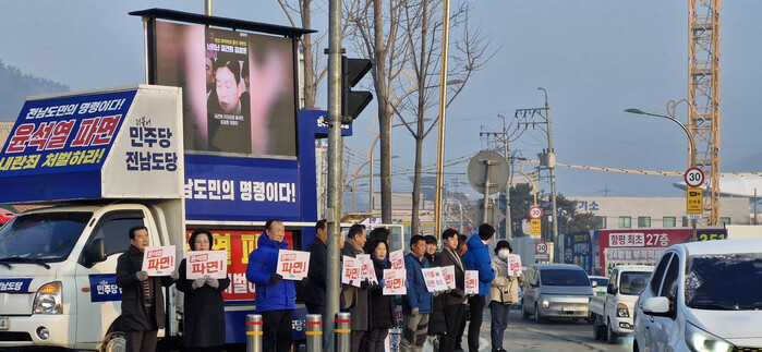 | ▲ 더불어 민주당 전남도당, 윤석열 파면을 촉구 차량 홍보단이 전남 함평에서 지역위원과 민주당 소속 군의원 등이 참여하고 았다(사진=황승순 기자) |