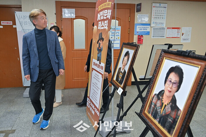 [광주=정찬남 기자] 김이강 광주광역시 서구청장이 29일 서구문화원 발산아트홀에서 열린 ‘서빛문화페스타’에서 찰나에 담은 이웃 사진 전시 등을 살펴보고 있다. / 광주광역시 서구청 제공