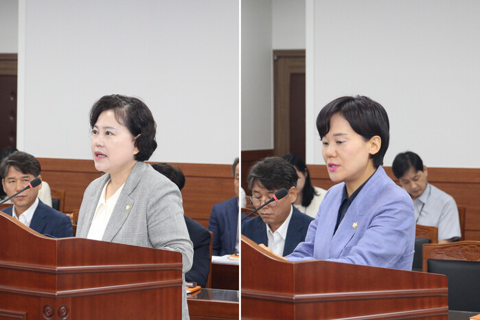 ▲ 복지환경위원회 위원들의 의원발의 조례안을 제안설명하고 있다. 좌측부터 박윤옥 의원, 한송연 의원