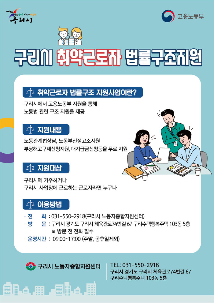 이에 구리시는 기존 노동자종합지원센터의 노동법률 상담 기능을 강화하고 권리구제 지원을 확대한다. 노무법인을 통해 ▲임금체불 ▲퇴직금 및 각종 수당 미지급 ▲부당해고 등에 대한 고용노동부 진정서 접수, 대지급금 신청서 작성 등 법률구조 서비스를 제공할 계획이다.