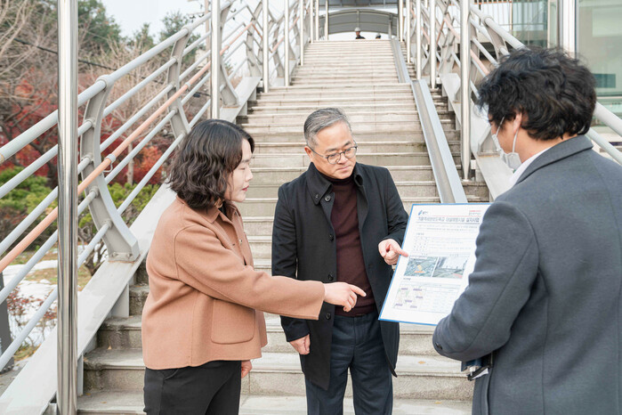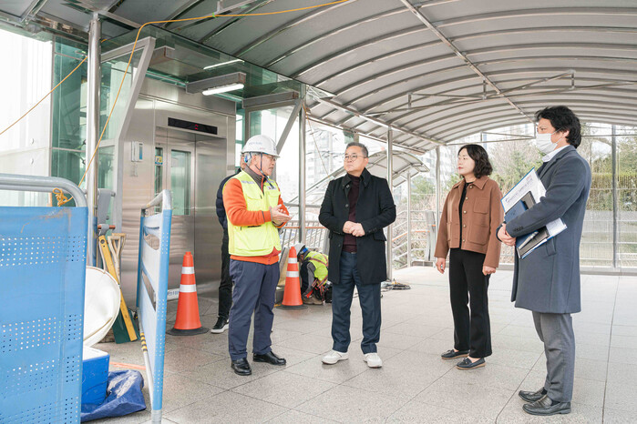 | ▲ 김길수 의원과 신나연 두 의원은 지난 2일 기흥구 구갈동의 기흥역세권보도육교에 설치되고 있는 캐노피(눈, 비 가림막) 공사 현장을 찾아 그간 진행 상황을 점검하고, 공사 관계자들에게 안전한 공사를 당부했다. |