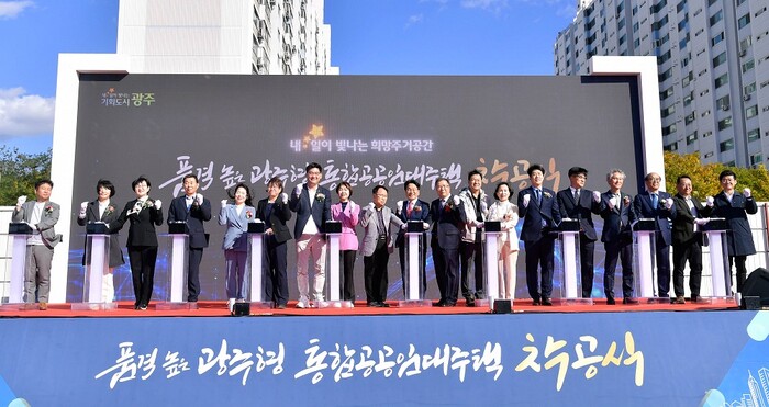 광주광역시(시장 강기정)와 광주도시공사(사장 정민곤)는 20일 상무지구 치평동 1166번지(옛 상무소각장 동쪽 부지)에서 강기정 시장과 정민곤 광주도시공사장, 심철의 광주시의회 부의장과 임미란·명진·김나윤·강수훈·안평환·박수기·김용임·조석호 시의원, 서구의회 의원, 정기섭 대한주택건설협회 광주전남도회장, 정인채 대한건축사협회 광주건축사회장, 시민 등이 참석한 가운데 ‘광주형 통합공공임대주택 건립사업 착공식’을 개최했다.