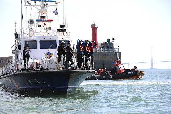 | ▲ 압된 불법 외국어선 선원(모의)을 대상으로 검문검색 중인 해양경찰 (사진제공=중부지방해양경찰청) |