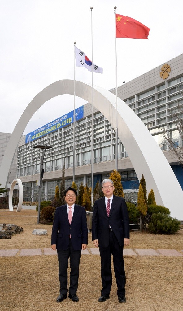 [광주=정찬남 기자] 강기정 광주광역시장이 6일 오후 시청 접견실에서 이임 인사차 방문한 장청강 주광주 중국총영사와 환담을 나눈 후 기념촬영을 하고 있다. /광주광역시 제공