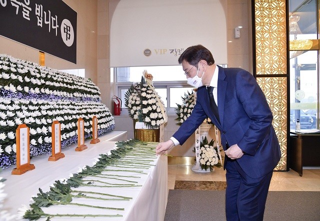 [광주=정찬남 기자] 이용섭 광주광역시장은 25일 오후 서구 한 장례식장 1층에 마련된 현대산업개발 신축 아파트 붕괴사고 피해자 합동분향소를 찾아 헌화 한 뒤 고인들의 빈소를 조문하고 유가족들을 위로했다./광주광역시 제공