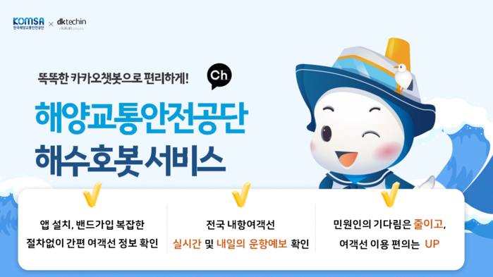 카카오톡 “해수호봇” 채널에서는 여객선 운항정보 외에도 선박검사 신청, 도면 승인 정보 조회 등 다양한 해양교통 서비스를 24시간 제공하여 이용객들의 편의를 높이고 있다.