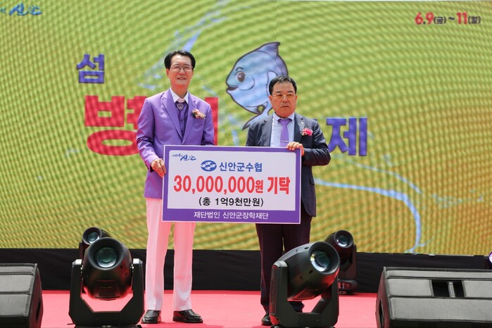[신안=황승순 기자]신안군수협(조합장 김길동)은 9일 섬 병어축제(지도 신안젓갈타운)에서 지역 인재 육성을 위해 사용해 달라며 신안군장학재단(이사장 박우량)에 3000만 원의 장학기금을 전달했다.